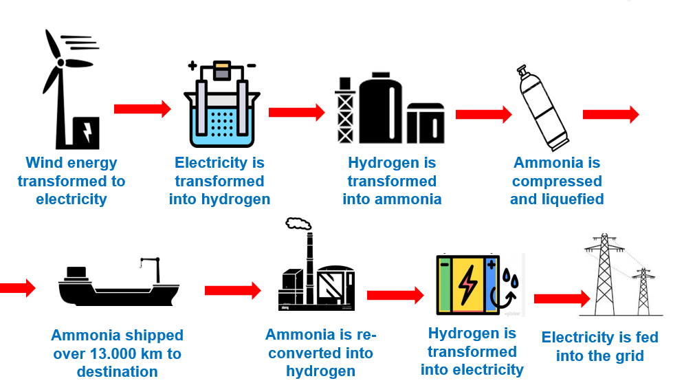 Der grüne Wasserstoff „GH2“ muss jetzt allerdings noch nach Deutschland gebracht werden. Ein Transport im Zeppelin hat sich nicht bewährt, aber auch per Schiff in Gasflaschen wäre es zu ineffizient. Man macht statt dessen aus H2 und dem Stickstoff der Luft ein anderes Gas: Ammoniak. Das lässt sich verflüssigen und kann bei tiefer Temperatur per Tanker transportiert werden.
