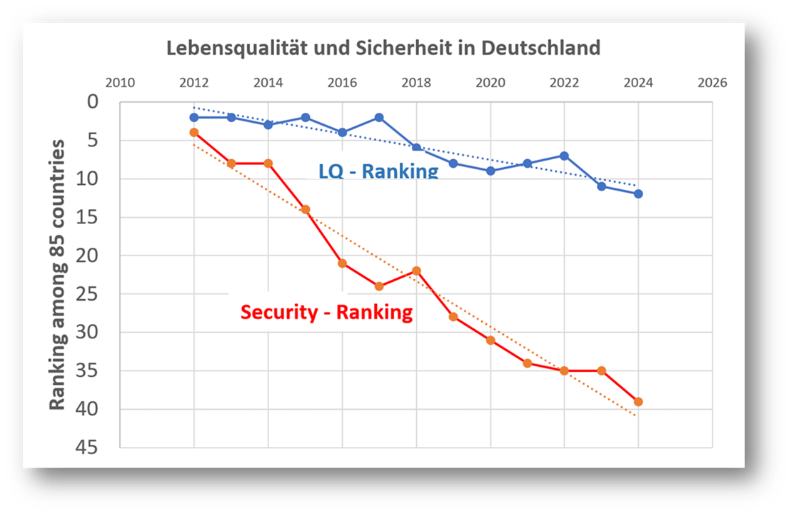Der Index für die Lebensqualität (LQ) in der Graphik setzt sich aus einer Reihe von Parametern zusammen, wie etwa Lebenshaltungskosten, Gesundheitssystem, Bezahlbarkeit von Immobilien und Sicherheit. Betrachten wir den Faktor Sicherheit nun für sich alleine, dann ist die Veränderung für Deutschland nicht nur dramatisch, sie ist katastrophal. Wir sind in 12 Jahren von Platz 4 auf Platz 38 abgestürzt und kommen heute zwischen Russland und Serbien zu liegen.