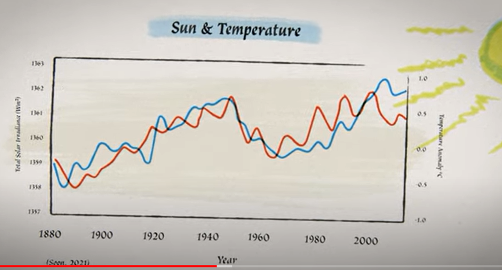 Es sind unterschiedlichste Prozesse welche die Erdtemperatur bestimmen, manche davon laufen auf der Erde selbst ab, manche in der Sonne, und wieder andere im übrigen Weltall. So hat die Sonne ihre Launen und strahlt manchmal mehr und manchmal weniger. Insbesondere schwankt ihre Leistung in Zyklen von 11 Jahren, die sich dann in der Erdtemperatur wiederspiegeln (siehe Graphik unten). Aber auch von weiter weg wird eingegriffen: Aus Entfernungen von Tausenden von Lichtjahren kommt kosmische Strahlung, die letztlich die Bildung von Wolken beeinflusst, und damit den Anteil des Sonnenscheins, der an deren Oberseite zurück ins All reflektiert wird.