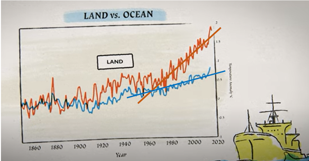 Vielleicht gibt es in der gleichen Gegend noch eine andere Wetterstation, mit deren Daten wir dieselbe Prozedur machen können. Und siehe da: jetzt hat diese Linie fast keine Steigung! Wie kann das sein? Nun, die erste Station stand 1950 noch mutterseelenallein auf einer grünen Wiese. Seither aber wurde die Gegend bebaut. Es wurden Straßen gelegt, deren schwarzer Asphalt in der Sonne heiß wird, und Häuser, die im Winter geheizt werden. Davon hat die erste Wetterstation etwas abbekommen, die zweite aber nicht – und bedenken Sie, wir messen hier hundertstel Grade! Im Zentrum einer Großstadt aber kann es bis zu 5°C wärmen sein, als in ihrer Umgebung! Und wieder anders ist es, wenn Wetterbojen oder freundliche Handelsschiffe die Temperatur der Luft über dem Meer messen, das ergibt etwas ganz  anderes. (Siehe die blaue Kurve in der Graphik oben).)