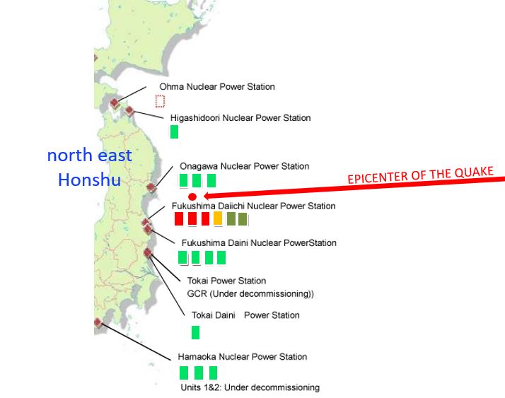 Entlang der Ostküste im Norden der Insel Honshu gab es eine Reihe von Kernkraftwerken (im Bild dargestellt durch rote Punkte) mit je einem oder mehreren Reaktoren, die von Erdbeben und Tsunami getroffen wurden. Bei den ersten Erdstößen schalteten sich alle Reaktoren automatisch ab und setzten Backup Kühlsysteme in Gang.