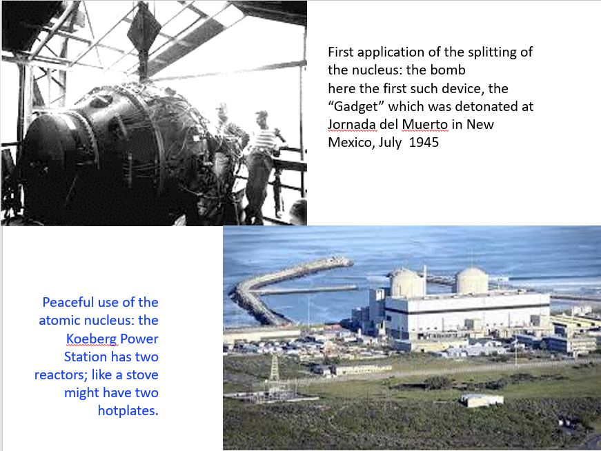 40 Jahre später ging das Kraftwerk in Koeberg ans Netz. Es liegt in der Nähe von Kapstadt, hat zwei Druckwasserreaktoren mit je 0,9 Gigawatt elektrisch und ist das einzige AKW auf dem afrikanischen Kontinent. Es hat keine Kühltürme, weil es das Meerwasser zur Kühlung nutzt.