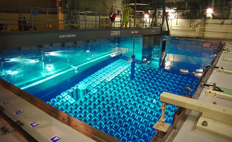Obwohl radioaktive Strahlung unsichtbar ist, erscheint im Wasser ein bläuliches Licht (siehe Abbildung). Das wird von Gammastrahlen erzeugt, die aus den Brennstäben kommen und mit Elektronen der Wassermoleküle zusammenstoßen. Die werden bei der Gelegenheit auf über Lichtgeschwindigkeit (im Wasser) beschleunigt und erzeugen die sogenannte Cherenkov Strahlung. (Hier ein persönliches Erlebnis: als Safeguards Inspektor für die Internationale Atombehörde schaute ich in einen solchen Pool mit seiner magischen Strahlung, als da plötzlich ein Taucher im Wetsuit im Wasser schwamm. Ich hoffe, dass er sich nachher gut geduscht hat.)