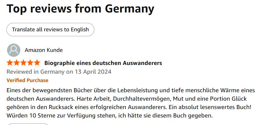Eines der bewegendsten Bücher über die Lebensleistung und tiefe menschliche Wärme eines deutschen Auswanderers. Harte Arbeit, Durchhaltevermögen, Mut und eine Portion Glück gehören in den Rucksack eines erfolgreichen Auswanderers. Ein absolut lesenswertes Buch! Würden 10 Sterne zur Verfügung stehen, ich hätte sie diesem Buch gegeben.